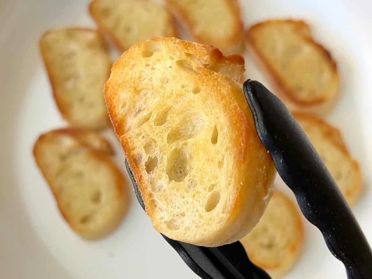 - Slice the baguette. On medium heat, add olive oil as needed and grill bread on both sides until golden and crunchy. Alternatively, you can brush oil on baguette and bake in the oven at 350ºF (175℃) for 15 minutes, flipping slices halfway.1 baguette, olive oil