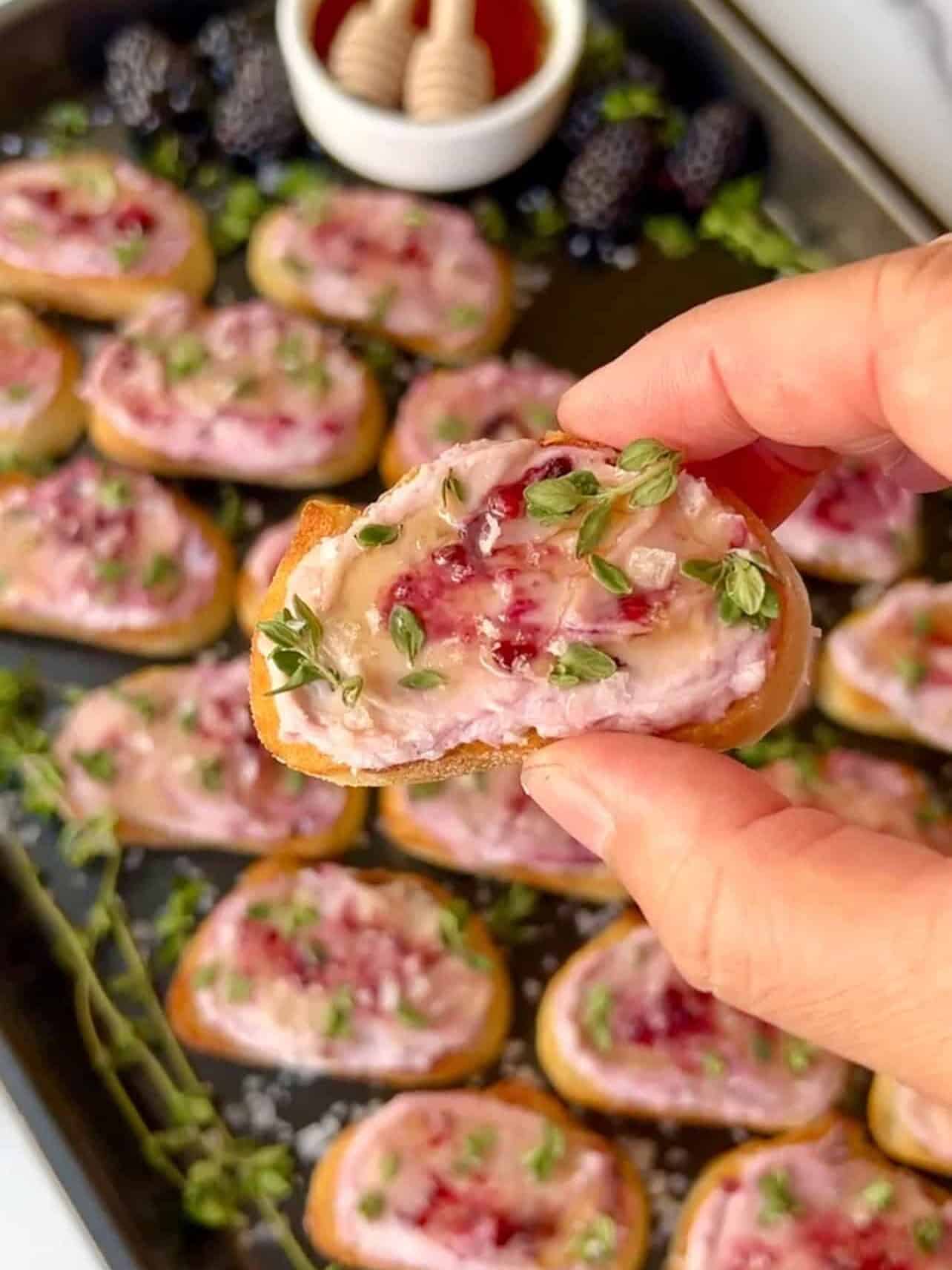 Whip up this Easy Blackberry Goat Cheese Crostini for any party, get-together, or girls night in just 15 minutes! Marble creamy goat cheese with your favorite fruit jam, spread on top crusty grilled baguette, and finished with honey, fresh thyme, and flaky sea salt. It's sweet, savory, and herbaceous - and your friends will be shook how this simple recipe creates such a stunning platter.