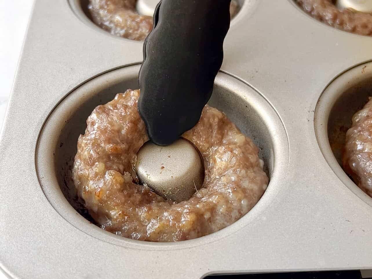 - Make sausage rings WIDE: Fill each cavity to the edge and leave a wide circle in the center. If you skip this step, it will naturally shrink towards the center and you may lose the donut hole shape.