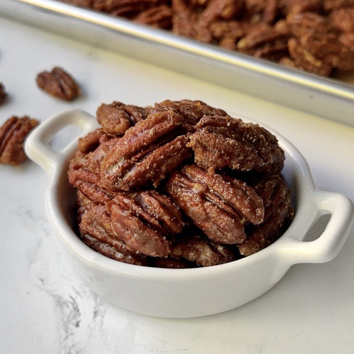 You can store cooled candied pecans in an airtight container/bag for up to 1 week at room temperature, 3 weeks in the fridge, and 2-6 months in the freezer. To thaw, allow them to come to room temperature on the counter. You can then revive them by baking at 350ºF on a baking sheet for 5-10 minutes or until crisp.