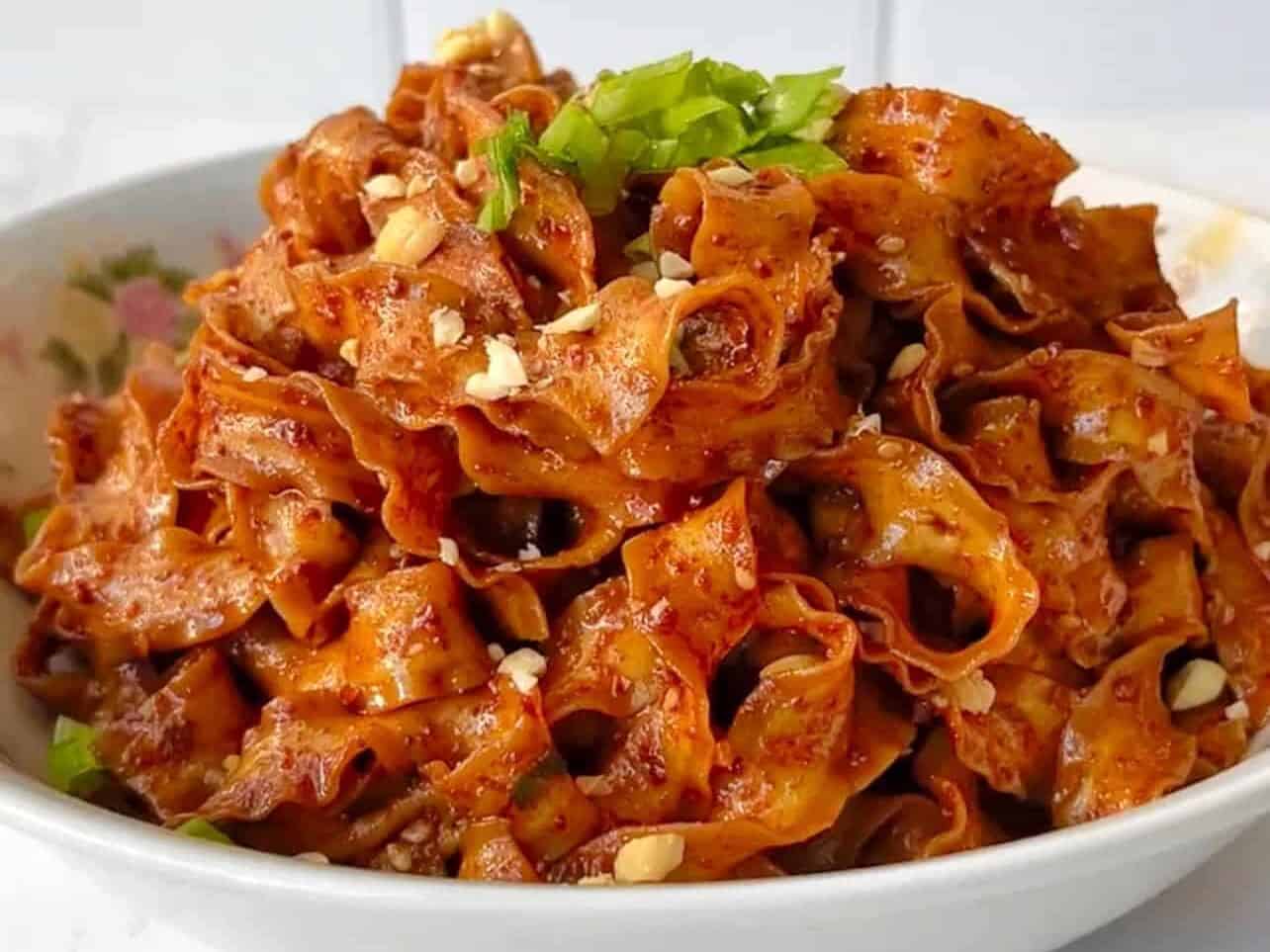 - Wheat noodles: I'm using ribbon noodles in this recipe - their wavy shape holds sauce well and has a very satisfying bite. You can also use flat wheat noodles, ramen, or egg noodles. To make it gluten-free, use rice noodles. Cook per package instructions.